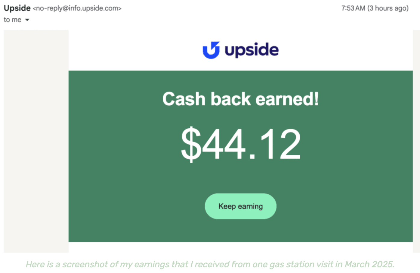 | Hi there! Do you know the easiest way to save money on gas for your car? I recently used Upside while filling up my gas tank and ended up earning $44.12 in cash back! I think this is the most I've ever received from just one gas station visit using this app. I was on empty and happened to stop at a gas station listed on the app, which had an amazing offer – $0.99 back per gallon + an extra $0.14 per gallon. Most offers are around $0.30 per gallon, but sometimes you'll find special promotions. I hadn't used the app in a little while and I think this was to entice me to come back. Whatever the reason, I'm happy to get over $1 per gallon back on something I was needing to do! The best part? I redeemed my cash back the very next day! Here's proof: The amount you can get back depends on where you live. So, you may see $0.25 back per gallon or you may see $0.90 - it can vary. But, it's free money and super easy to use. If you haven't tried Upside yet, I highly recommend it. It's one of the easiest ways to save money on gas, groceries, and restaurants. Oh yeah, and if you haven't signed up for Upside yet, now's the perfect time. I'm also sharing a special invite code that you can use to earn an extra $0.25 per gallon cash back (on top of the normal offer) the first time you use the app. My special invite code is AFF25 Please click here to try out Upside. Enjoy! Michelle from Making Sense of Cents P.S. You can learn more about Upside in my review here - Upside Review: Is This App Worth The Cash Back At The Gas Pump? P.P.S. Another app I tested out earned me $302 in just one week - for real! You can learn more at How I Made $302.80 Playing Games on My Phone (In One Week). *I am an affiliate for Upside. |